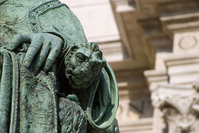 luglio 2005 - Particolare della statua in bronzo di Sisto V di fronte al Santuario della Santa Casa